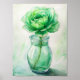 The image features a vibrant green flower elegantly placed in a clear glass vase. The flower stands out with its lush, vivid petals, radiating a fresh and lively energy. The transparency of the vase allows for a full view of the flower's stem and the water inside, enhancing the overall aesthetic. Soft natural light filters through, highlighting the delicate textures of the petals and creating a serene atmosphere. This simple yet striking arrangement adds a touch of nature's beauty to any space.