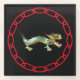 Dragon with green and white scales on body, gold and red spines on head, red tongue. Framed with red chain links on a black background.