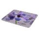 Glass cutting board with blue Irises and a place to add your name. The background is a grunge lavender so it's a very pretty board.