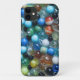 Macro photography of many glass marbles resting in shallow water, inside a pan lined with crumbled aluminium foil.