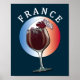 Illustration of a glass with a wave of red wine and France Flag with text: France.