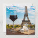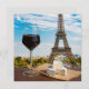 Glass of wine with brie cheese on Eiffel tower and Paris skyline background. Sunny view of glass of red wine overlooking the Eiffel Tower in Paris, France