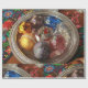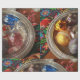 Glass ornaments in silver box with folk art wrapping paper