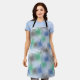 This apron has a mid-century modern design of starbursts in glaucous (blue), grey, light blue, and green.