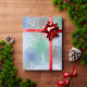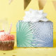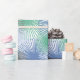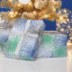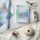 This wrapping paper has a mid-century modern design of starbursts in glaucous (blue), grey, light blue, and green.