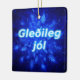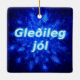 A swarm of blue fractal snowflakes. Icelandic text reading "Gleðileg jól" (Merry Christmas) appears in glowing blue and white.