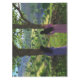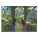Twin young ladies peer out from behind two trees down into a lush green glen between rocky hills, filled with little farms and hedgerows and stone walls and watered by a sparkling stream that cascades down the hills.