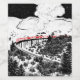 A black and white, landscape illustration of a famous railway bridge in Scotland. Glenfinnan Viaduct, with a red locomotive / train steaming over it.