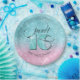 Add a touch of elegance to your table for a Sweet Sixteen with this paper plate featuring a unique decorative font in a trendy retro style, an eye-catching gradient background of glittering teal through pink. The striking number 'Sixteen' in a sparkling teal glitter effect is optional and can be deleted to use the template for other occasions. Use the provided template to add a celebrants name and birthdate. Search ID675 to see other products and colour options for this design.