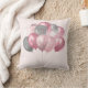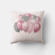 A pillow with an illustration of a bunch of balloons in pink and silver grey colours.
