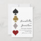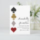 This custom save the date for the wedding invitation features a Las Vegas casino theme. The four suits in a deck of playing cards is printed on the left in a horizontal pattern. The spade is a black glitter design, the club is gold, the diamond is silver, and the hearts is a red glitter design. The names of the couple and sample wedding date are printed on the right in an elegant black font.