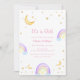 Cute "it's a girl" Rainbow moon and stars baby shower theme, design feature pastel colourful watercolor raibow and gold glitter moon star. fully editable template, easily customise the text. Great for a baby girl shower party whole year round.
