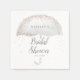 A pretty, feminine bridal shower paper napkin featuring rose gold glitter confetti sprinkles falling on a soft grey watercolor umbrella with bride to be's name and event title and date below.