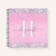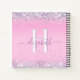 Monogrammed girly notebook featuring sparkly holographic purple and silver faux glitter confetti along the top and bottom against a pink background. Add your monogram initial and your name in a trendy purple script with swashes.