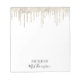 This modern white background with gold glitter drips notepad and elegant simple black script text are great design elements to be on this product. The great part here is that you can customise it by adding a name, your own information and text.