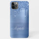 Custom elegant and girly phone case featuring blue faux glitter dripping against a blue faux metallic foil background. Monogram with your name in a stylish trendy white script with swashes.