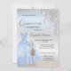 Elegant blue dress, champagne glass and silver glitter drips on a silver background.