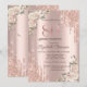 A modern, chic and glamourous invitation with glitter drips, and flowers on a rose gold background.