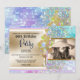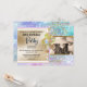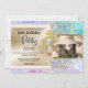 A beautiful faux shimmer pearlised background in vibrant shades of pink, purple and aqua blue forms a backdrop to glitter balloons resting on the edge of a gold and purple edged background and a photo frame that may be personalised to suit your occasion. These fabulous invitations are ideal for any girly or diva milestone birthday party you may be hosting or celebrating for your boss, mother, sister, daughter, niece, granddaughter or goddaughter.