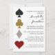 This elegant wedding invitation features a Las Vegas casino theme. The four suits from a deck of playing cards is printed on the left. The spade is printed in a black glitter design, the club is gold, the diamond is silver, and the heart is a red glitter design. The wedding information is printed on the right in a sophisticated black font.