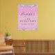 Pretty, glamourous and girly 12th birthday party welcome poster and photo prop with sparkly holographic purple, pink and silver faux glitter confetti along the borders against a pink background and her name in a soft grey trendy script.