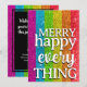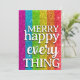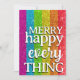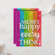 Faux glitter stripes feature the gay pride rainbow colours. Bold text on front says "Merry happy every thing". Black and white text template on the back allows for a personal message and a list of family names. Great no-photo christmas card option for queer families and allies.