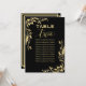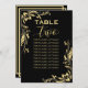 These elegant gold table number 2 seating chart cards are perfect for a simple wedding. feature a simple yet elegant design with gold script calligraphy on a black background with a frilly gold faux foil floral filigree in the corners.