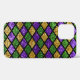 A vibrant Mardi Gras poster with shiny green, purple, and golden glittering diamonds.