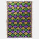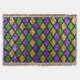 A vibrant Mardi Gras poster with shiny green, purple, and golden glittering diamonds.
