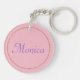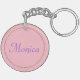 Pretty pink key chain, with graphics of a rose gold outlined pastel butterfly, on the front. The back of the key chain has a glittery rose gold dotted circle, with custom purple text ready to personalise. Lovely little gift idea for her.