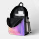 on this back pack is a colourful mythical unicorn with stars on an ombre lavender pink rainbow pastel backdrop complete with pink and lavender glitter where  can personalise it on the front pocket to make it uniquely your own. Girlish magical fantasy vibes.