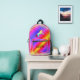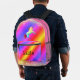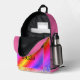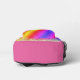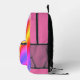 On this back pack is a colourful mythical unicorn on a pastel rainbow backdrop with gold glitter edging for extra glam. Can be personalised on the front pocket. Whimsical girly dreamy vibes.