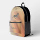On this back pack is a magical silver and grey unicorn with a string of stars on a soft ombre lavender and orange pastel rainbow backdrop with faux gold glitter edging for extra glam. Can be customised on the front pocket to make it uniquely your own. Whimsical girly glittery vibes.
