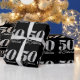 A 50 & Fabulous typography design with silvery grey glitter and foil on black colour wrapping paper.