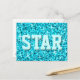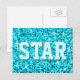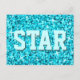 Postcard with a modern design featuring stars scattered over a stylised "sequin look" pattern background and 'STAR' in shades of blue. Can be used as a background for your own text, images and ideas. Please note this is a printed digital art image, it does not shine or contain real glitter or sequins.