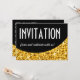 Invitation with a modern design featuring stars scattered over a stylised "sequin look" curved shape in shades of yellow gold set against a black background with 'Invitation' 'come and celebrate with us!' written in white. Can be used as a background for your own text, images and ideas. The text can easily be changed using the template provided or click the 'Customise It' button to make further alterations. Please note this is a printed digital art image, it does not shine or contain real glitter or sequins.