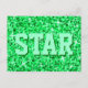 Postcard with a modern design featuring stars scattered over a stylised "sequin look" pattern background and 'STAR' in shades of green. Can be used as a background for your own text, images and ideas. Please note this is a printed digital art image, it does not shine or contain real glitter or sequins.