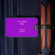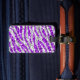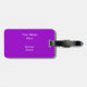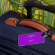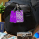 Luggage tag with a modern printed design featuring stars scattered over a stylised "sequin look" zebra stripe pattern background. Your choice of text is written in white on a purple background. A customisable design in shades of purple and silver grey for you to personalise with your own text, pictures and ideas. Please note this is a printed digital art image, it does not shine or contain real glitter or sequins.