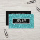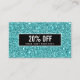 Modern, girly networking discount or coupon card featuring digital image of luxury turquoise glitter pattern. Black stripe overlay. Great for beauty, fashion , entertainment and event professionals.