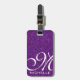 purple glitter custom luggage tag with leather strap: large script monogram and name