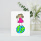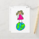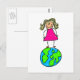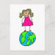 Cute cartoon whimsical illustration of a happy little stick figure girl standing ontop of the world. Easily customise and choose your own background colour or add text. Image available on various gifts and products.