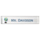 Stylish school teacher's desk nameplate done in white, with graphics of a desk world globe, on the left side. Personalise the blue text to read what you want. Makes a great gift idea.