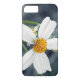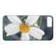 The image on this iPhone 8/7 Case is an original photograph by MaeFlowers of a wildflower. It is a tiny white flower with five petals and a yellow orange pompom in the centre. The photo is a closeup, with the flower itself in sharp focus, the flower’s green stem and leaves in soft focus, and the rest of the background in soft shades of dark bluish grey. The flower is a weed, filling the lawn with whiteness.