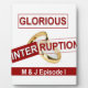 The Glorious Interruption: A Golden Beginning image features a clean, white background. It includes several text elements and a central graphic, creating a minimalist yet impactful composition. At the top, the word "GLORIOUS" is enclosed in a thin red rectangular border. The word "INTERRUPTION" is placed diagonally across the centre, also framed by a red border, overlapping a graphic of two golden rings. Below the rings, the text "M & J Episode I" is similarly bordered in red, adding to the overall design.