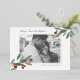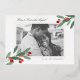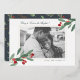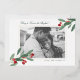 A modern religious holiday photo greeting card with your favourite horizontal photo taking centre stage, accented with two green and red watercolor berry branches and a real gold pressed foil frame. The headline greeting reads "Glory to God in the Highest" (the popular angelic greeting in the nativity story) in sage green script font, which is editable. Sign off with your family name. The reverse features a watercolor pattern of berries and branches on a dark green background.