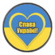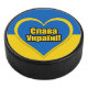 Hockey puck with the flag of Ukraine, heart in the Ukrainian colours, and text saying "Glory to Ukraine" in Ukrainian