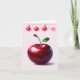 A playful style accents this charming cherry note card. A large glossy red cherry on a stem is the main focus, it is accompanied by a row of soft pink cherries and a heart at the top of the card. Ready for you to customise with a message as desired. A delightful fruit motif that would be appreciated anytime of the year.