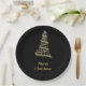 A stunning glossy gold Christmas tree shimmers brilliantly against a sleek black background, exuding elegance and holiday cheer. The words "Merry Christmas" in festive typography complete this enchanting composition, making it a perfect holiday design.