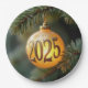 A golden ornament with "2025" is hanging from a green pine tree branch, radiating a warm glow.