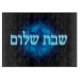 Features Hebrew text reading, "Shabbat Shalom" (שבת שלום), "a peaceful Sabbath," or "Sabbath of peace," in glowing blue and white on a blue, fractal background image. A nice cutting board for your Shabbat challah.